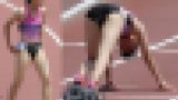 ローアングルからレオタード股間にガブリ寄り、鼠蹊部の膨らみまではっきり映し出します。