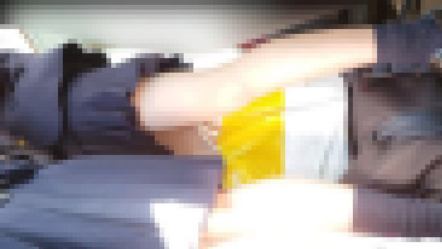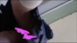荷物をまたいで立っているせいか、太ももの付け根まで見えてしまっているのがいいです。