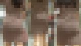 2人共、タイトスカートを掴み脱ぎます。肉厚股間に、細まるパンティラインが鮮やかなピンク色レースを確認します。鏡の前で屈み座りデカパイのキレイな乳輪とアンダーバストラインが見えます。奥のお姉さんのラベンダー色パンティの紐と横ボディラインが垣間見えます。